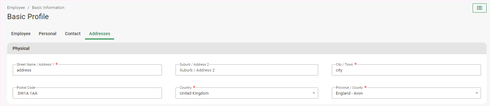 Addresses in the United Kingdom should be captured using the Street Name / Address 1 and Suburb / Address 2 as the Full Payment Submission (FPS) requires addresses to be broken down into at least two elements. The post code format is a maximum length ...