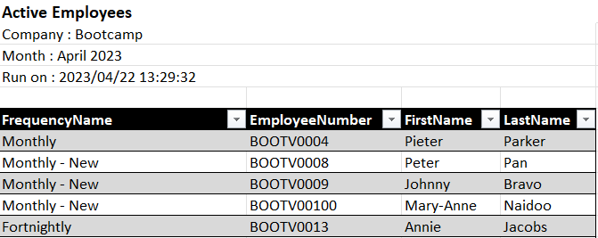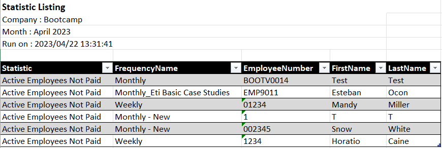 Active Employees: This figure indicates that there are 66 employees currently employed. Unpaid Active Employees: This figure suggests that, at the time of the query, none of the active employees have been paid in the month of August. Other ...