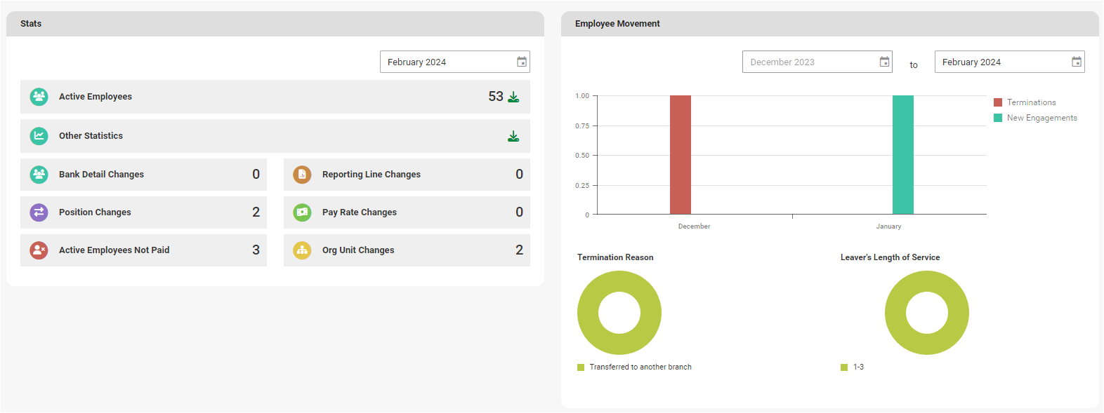 Note! The "Stats" dashboard widget now has two download functions that allow users to download and view details of the headcounts displayed on the dashboard. Only users with full access to all employees within the company will be able to download the reports.