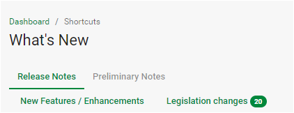 It displays Release Notes and Preliminary Notes which contain new features, bug fixes (enhancements) and legislative changes.