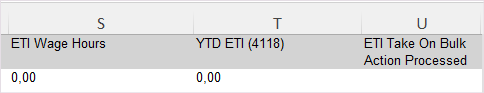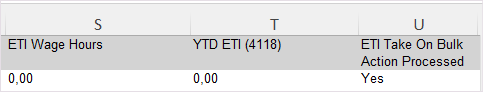 The function of this field is to indicate whether an ETI Take On was processed for employees in the company for ETI reconciliation purposes and to check if there have been adjustments made to employees' ETI using the ETI Take On functionality on the Bulk Actions screen.