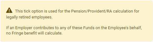 This option is used for the Pension/Provident/Retirement Annuity calculation for legally retired employees. No fringe benefit is applicable if the employer contributes towards a retirement fund on behalf of an: