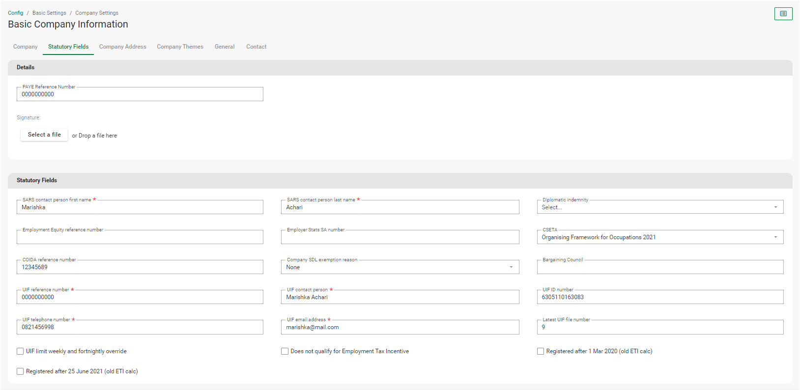 Navigate > Configuration > Basic Settings > Company Settings > Basic Company Information > Statutory Fields