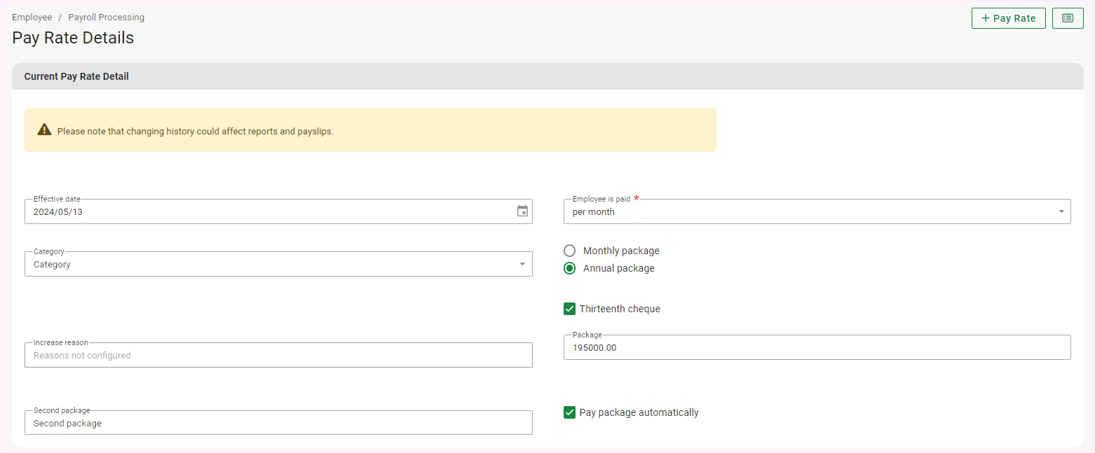 If the "Thirteenth Cheque" checkbox on the Pay Rate Details screen is enabled, the affected employee's Basic Pay amount will be calculated by dividing the annual package captured by thirteen.