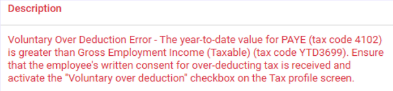 When the total value on tax code 4102 exceeds the 'Gross Employment Income (Taxable)' (YTD 3699) value, and the 'Voluntary over deduction' checkbox is enabled, the following error message will be triggered.