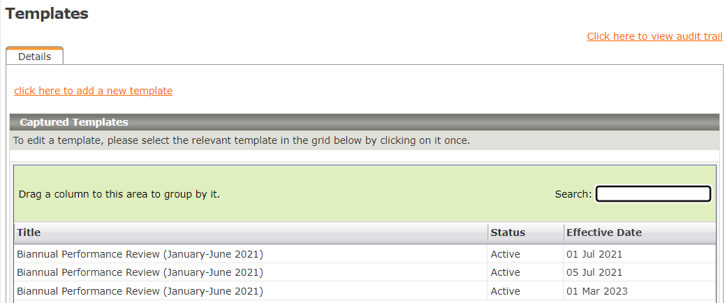 If the effective date of an existing template is edited on the Template Definition screen is changed, a copy of the template will be created effective from the new date specified.