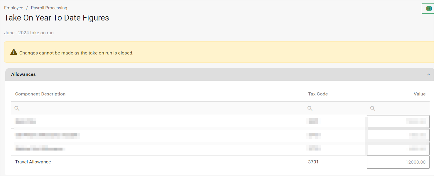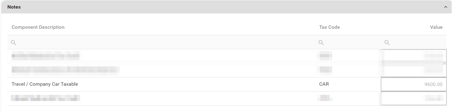 Travel / Company Car Taxable component will appear in the Notes section of an employee's Take On Year to Date Figures screen after the Travel Allowance component has been added and an amount advised.