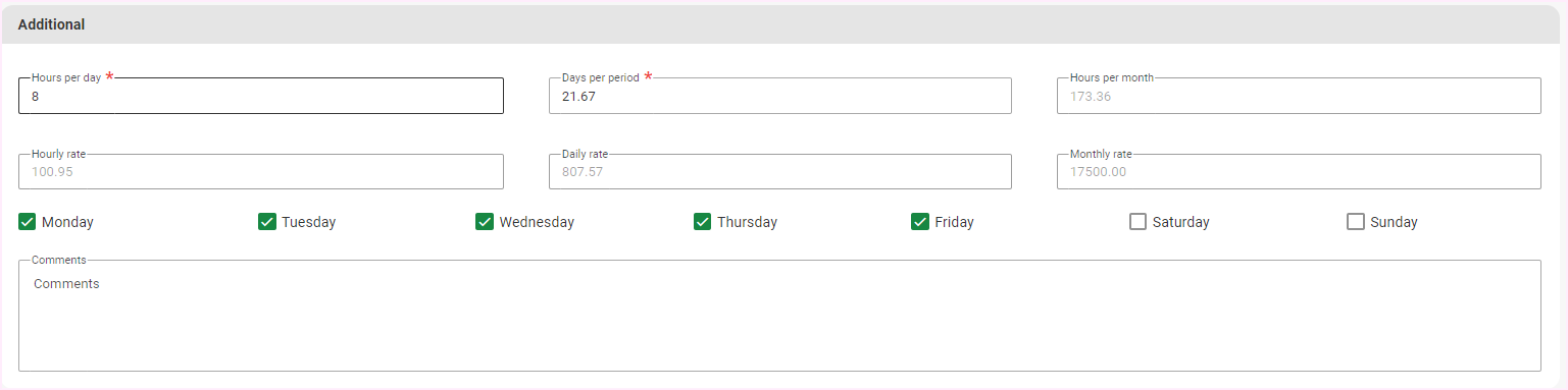 The working days for an employee can be configured on the Pay Rate details screen under the Additional section.