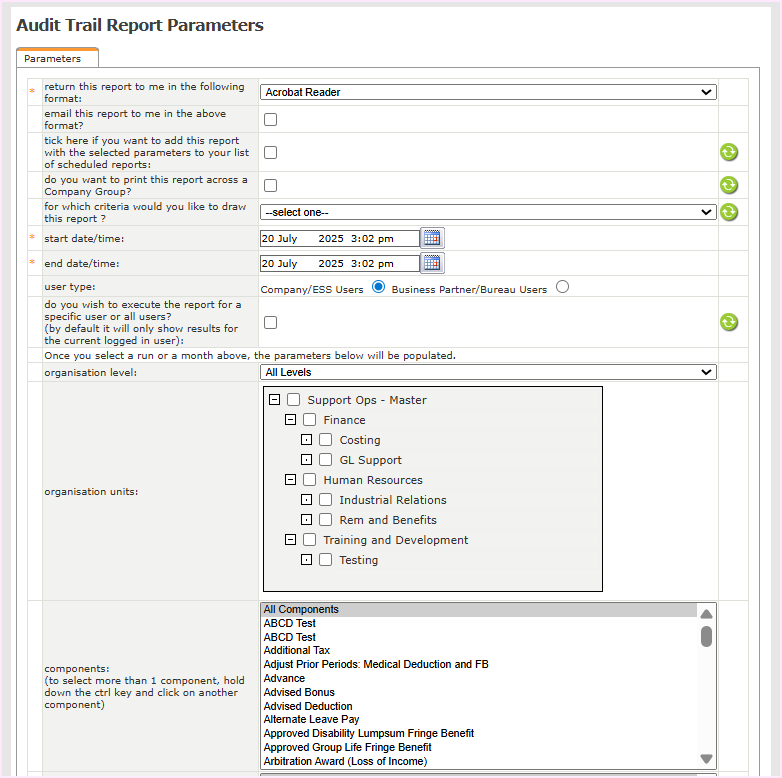 This feature is available on all Deel Local Payroll powered by payspace editions The Audit Trail Report provides an audit trail for selected user profiles and screens. By default, it will only generate information the for the user currently logged in ...