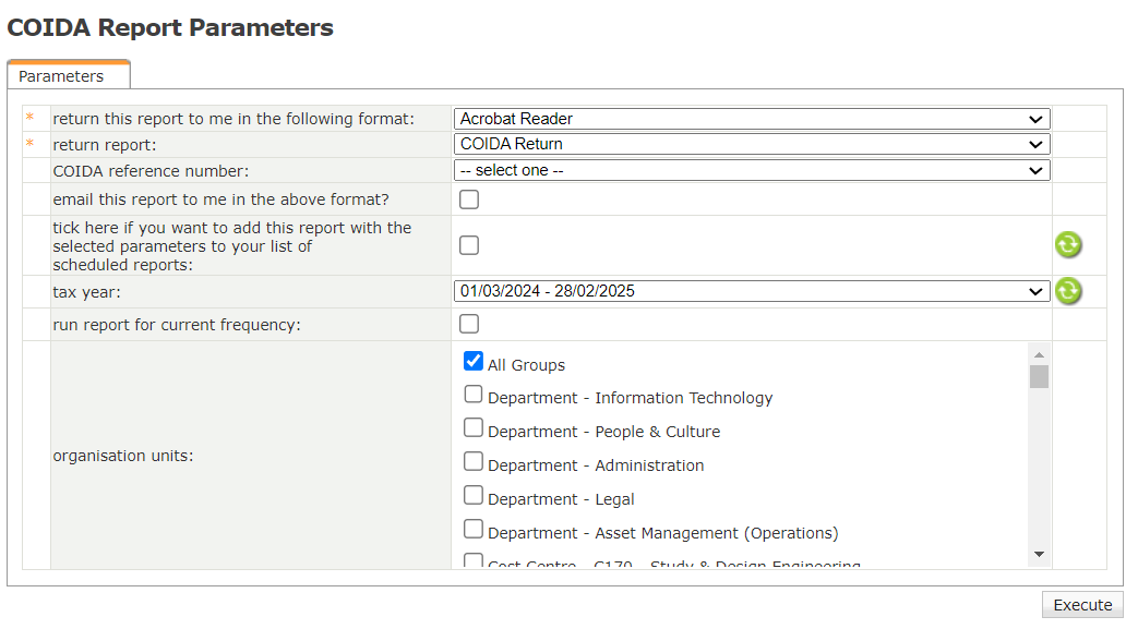The COIDA Return report can be downloaded under the Legislative report category on the Standard (Classic) tab on the Reports screen. It is an option that must be selected when accessing the COIDA report.