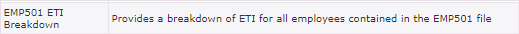 This report is available on all PaySpace editions. A new field: "ETI Take On Bulk Action Processed" has been added to the EMP501 ETI Breakdown report which will display as follows when extracted. Navigate > Reports > Reports > Classic > Legislative ...