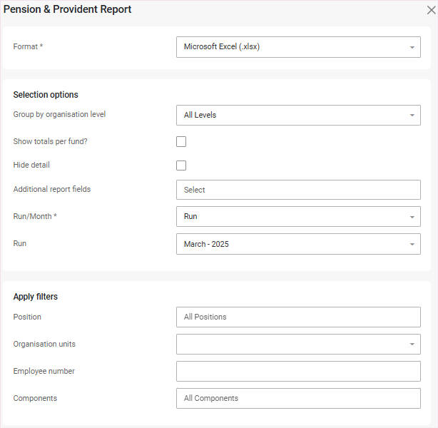 The Pension and Provident report provides a listing of the employees' Pension/Provident contributions for a chosen period.