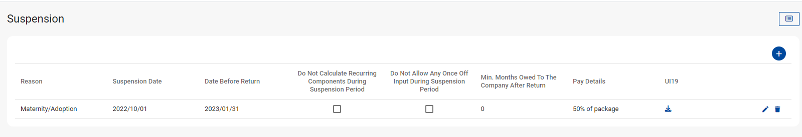 A suspended employee's UI-19 can be downloaded directly from their Suspension screen, i.e. click on the download icon in the UI19 column on the History grid.