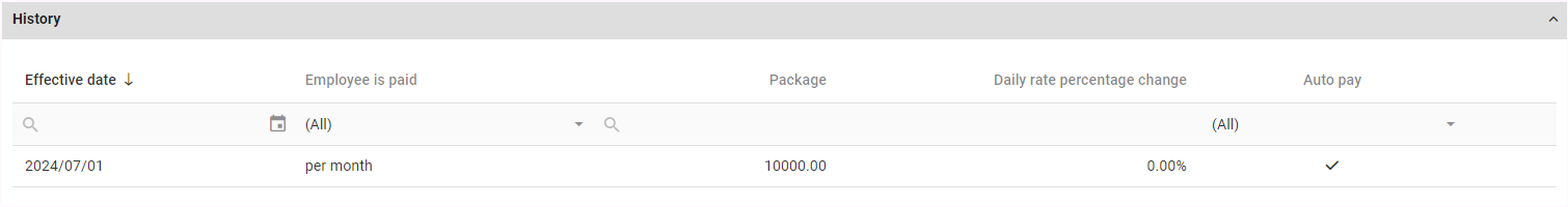 A list of an employee's Pay Rate records can be viewed on the History Grid at the bottom of their Pay Rate Details screen.