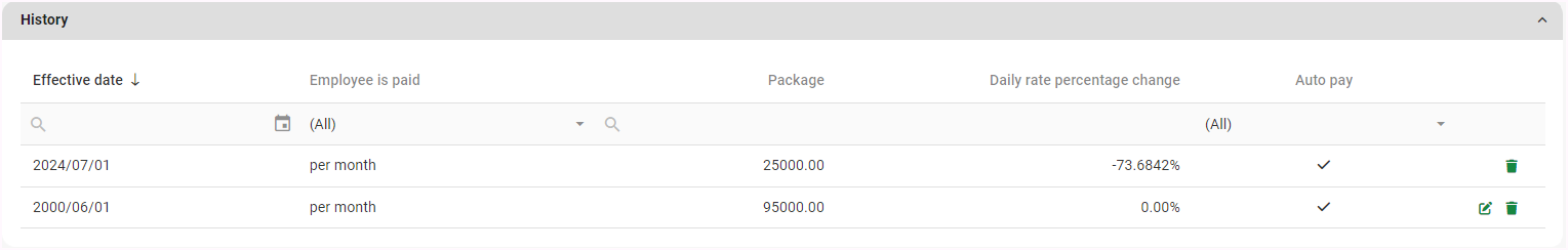 A list of an employee's Pay Rate records can be viewed on the History Grid at the bottom of their Pay Rate Details screen.