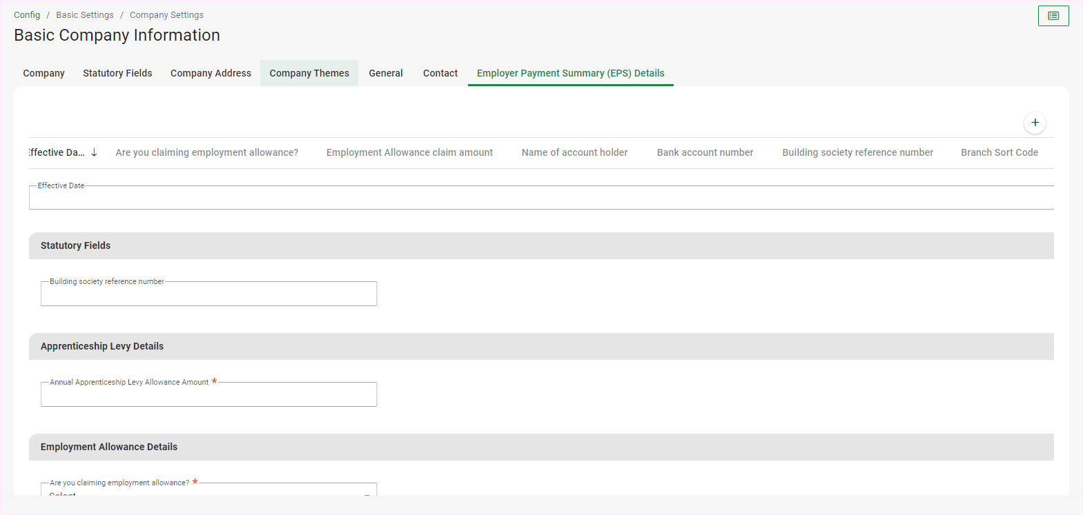 Navigate > Configuration > Basic Settings > Company Settings > Basic Company Information > Employer Payment Summary (EPS) Details