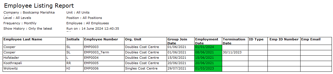 The Employee Listing report provides displays all the employment dates of all the company's employees, among others.