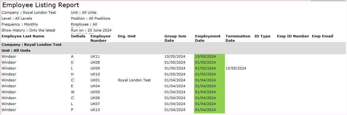 The Employee Listing report provides displays all the employment dates of all the company's employees, among other