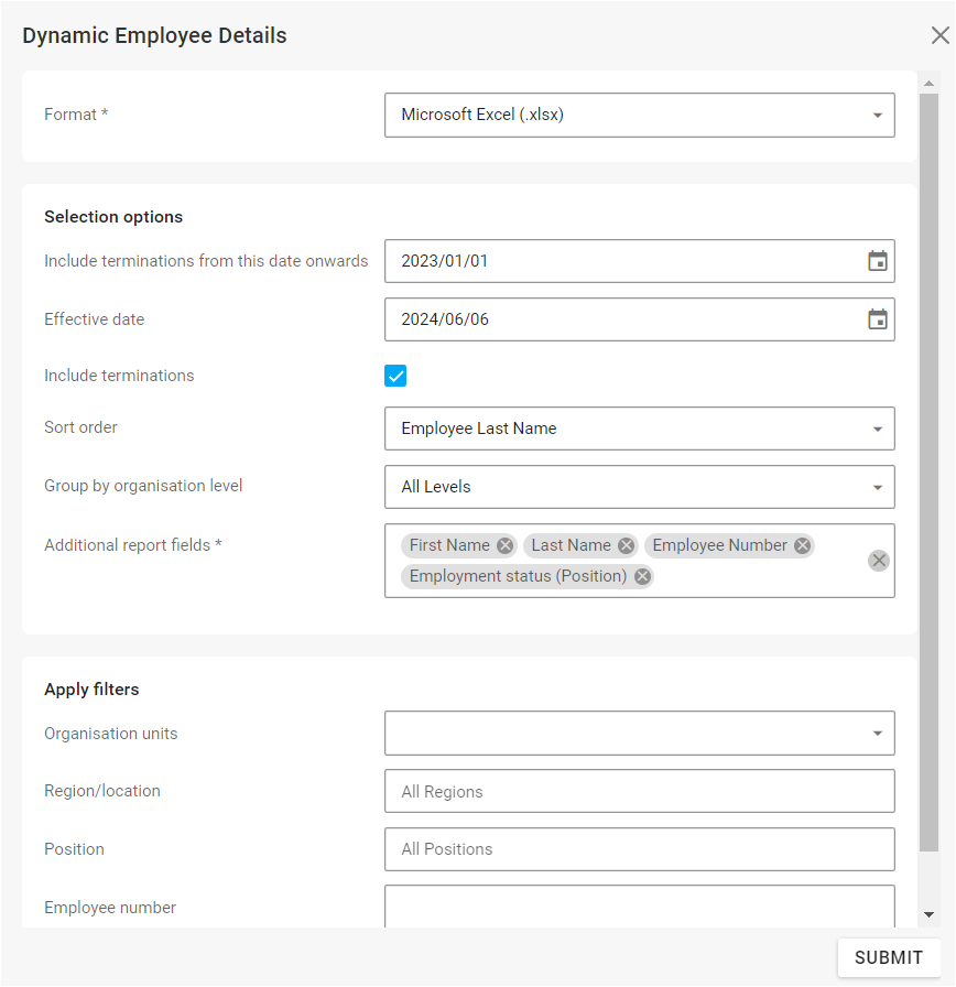 This report is available on all PaySpace editions. The Dynamic Employee Details report can be extracted using the additional report field: "Position", along with required columns such as the employee's first name, last name, employee number, etc. ...