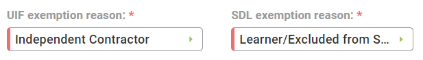 SDL. Configure their UIF and SDL exemption reasons to "Independent Contractor" and "Learner/Excluded from Skills Levy" respectively under the "Exemptions and Other" section of the Basic Profile screen.