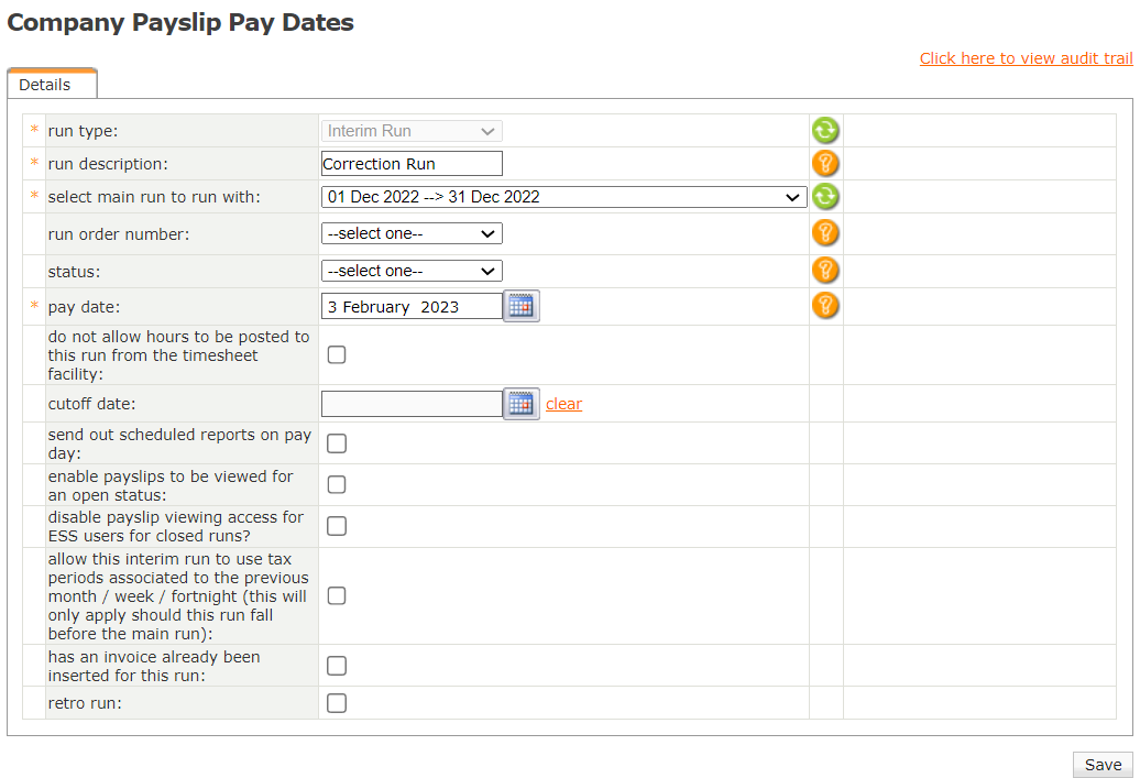 Overview Interim runs enable you to create additional runs within the same processing period. Interim runs are created from the Company Payslip Pay Dates Screen. Edition This feature is available on all PaySpace Editions. Navigation Navigate > ...