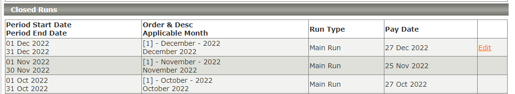 Navigate > Payroll Cycle > Payslip Pay Dates > Closed Runs