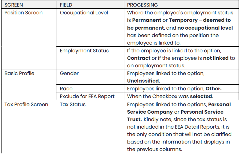 Employees may be excluded from the EEA Statutory Reports (i.e. the EEA2 and EEA4 Reports) due processing errors on the payroll. These errors need to be rectified for the employees to be included in these reports. why-are-certain-employees-excluded-from-the-eea-statutory-reports