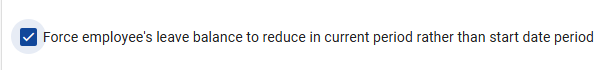 Future dated leave applications will reduce the current leave period's leave balance when the "Force employee's leave balance to reduce in current period rather than start date period" checkbox under the Leave Calculation section on the Leave Settings screen is enabled.