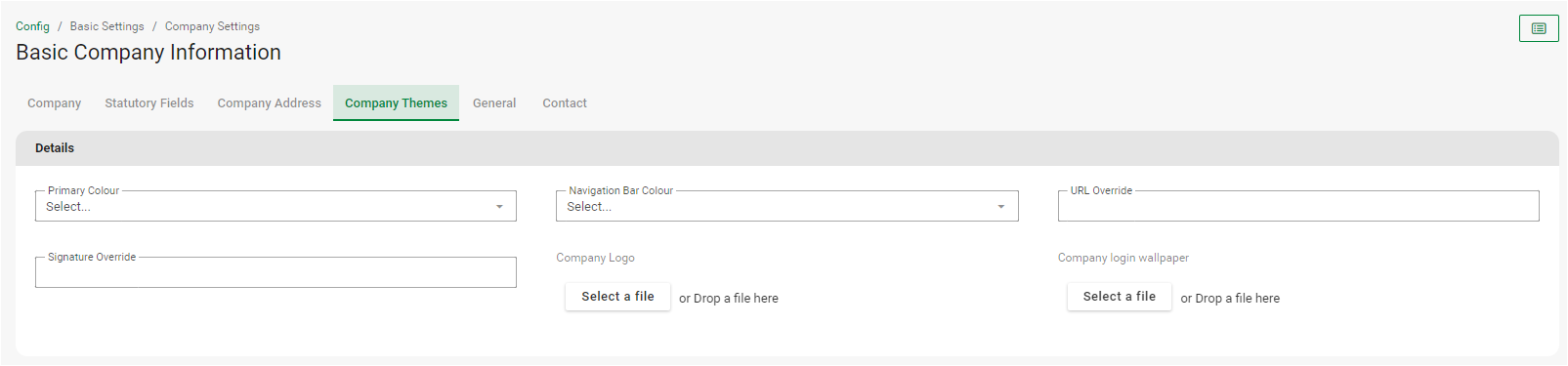 Navigate > Configuration > Basic Settings > Company Settings > Basic Company Information > Company Themes