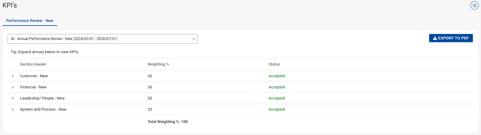 This feature is available on Premier and Master editions The error "This sections KPI's do not equal 100%" will display because the KPI on the Template Section does not equal 100%. Navigate > Config > Human Resources > Performance Management > ...
