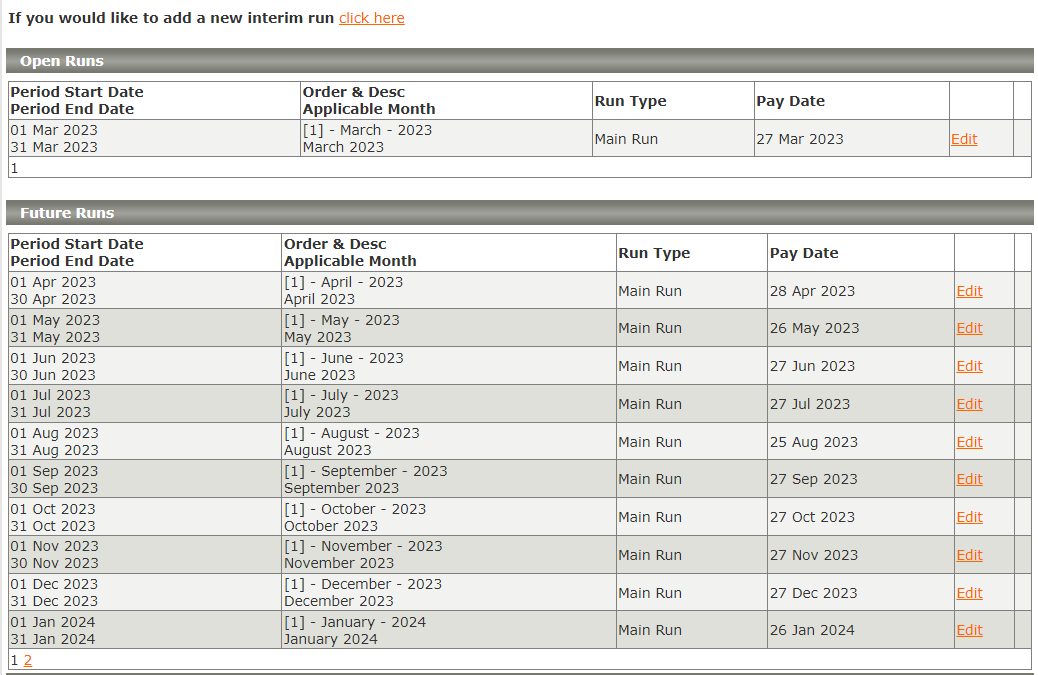 Overview The Payslip Pay Dates are configured when the frequency is created on the system. Based on the selections made during this process, the system will automatically create pay runs and indicate the start and end dates, a description, and the ...