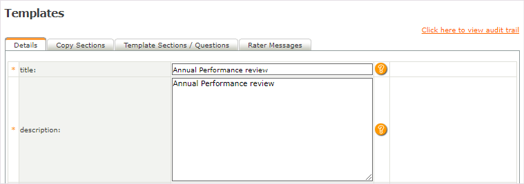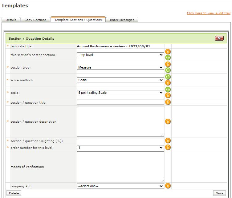 This feature is available on Premier and Master editions. Template sections / questions can be created and maintained on the Template Definition screen. Navigation > Config > Human Resources > Performance Management > Template Definition Access the ...