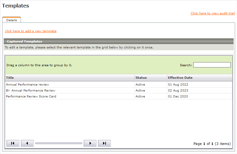 Navigate > Configuration > Human Resources > Performance Management > Template Definition