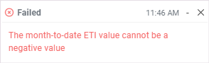 The error "The month-to-date ETI value cannot be a negative value" will display when a user has captured a negative value for the affected employee on the ETI Take-On MS Excel template that resulted in their month-to-date ETI in a negative value. To resolve the error, correct the employee's month-to-date ETI value captured on the template, so that it does not result in a negative value.