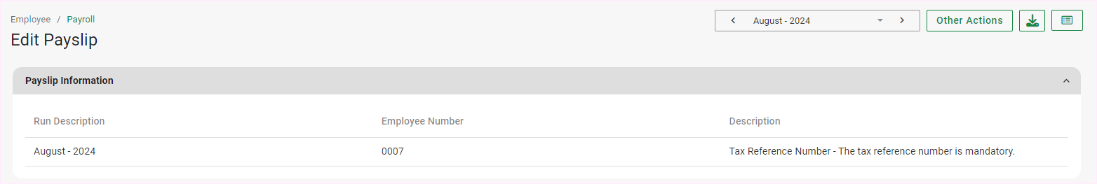 The warning message "The tax reference number is mandatory" will display underneath the "Payslip Information" section on employee's Edit Payslip screen.
