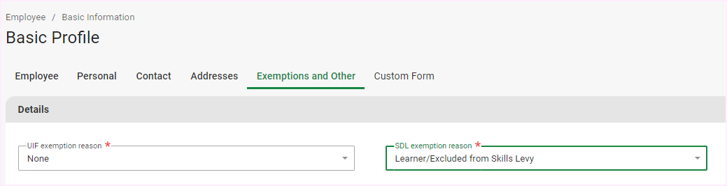 This feature is available on all Deel Local Payroll powered by payspace payroll editions The Skills Development Levy (SDL) exemption reason can be configured on employee level on the Basic Profile screen. Navigate > Employee > Basic Information > ...