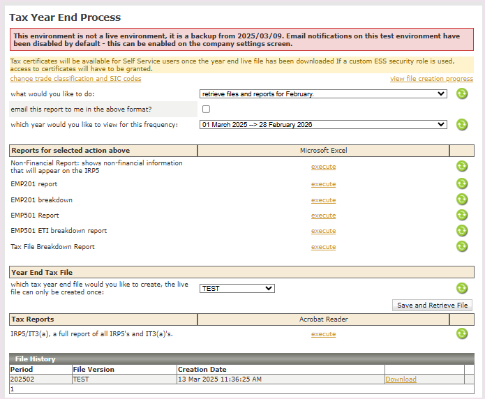If the Test or Live CSV File is not available for download on the history grid after selecting the "Save and Retrieve" button, the delay could be due to a large number of tax files being exported for the Annual Tax submission. The file size may also be a factor in the delay.