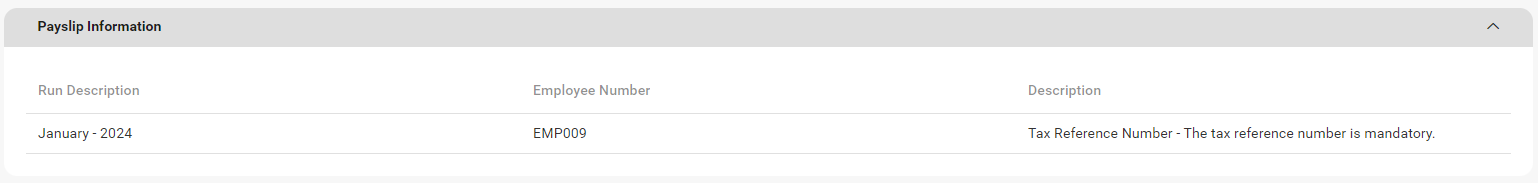The warning message "The Tax reference number is mandatory" will display underneath the payslip information tab on an employee's payslip.