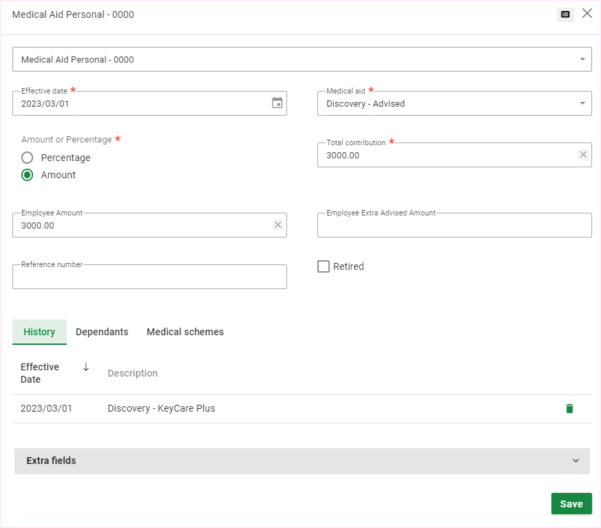 The "Employee Amount" field has to be completed in order for the personal medical aid component to reflect on the affected employee's Edit Payslip screen.