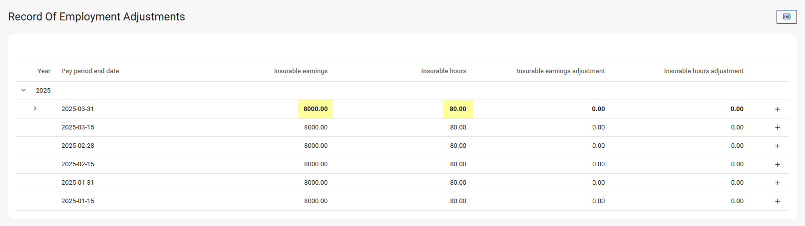 The Insurable Earnings and Hours can be modified by creating an adjustment on the employee's Record of Employment Adjustment screen. Navigate > Employee Record > Payroll Processing > Record of Employment Adjustments > Navigate to the relevant record ...