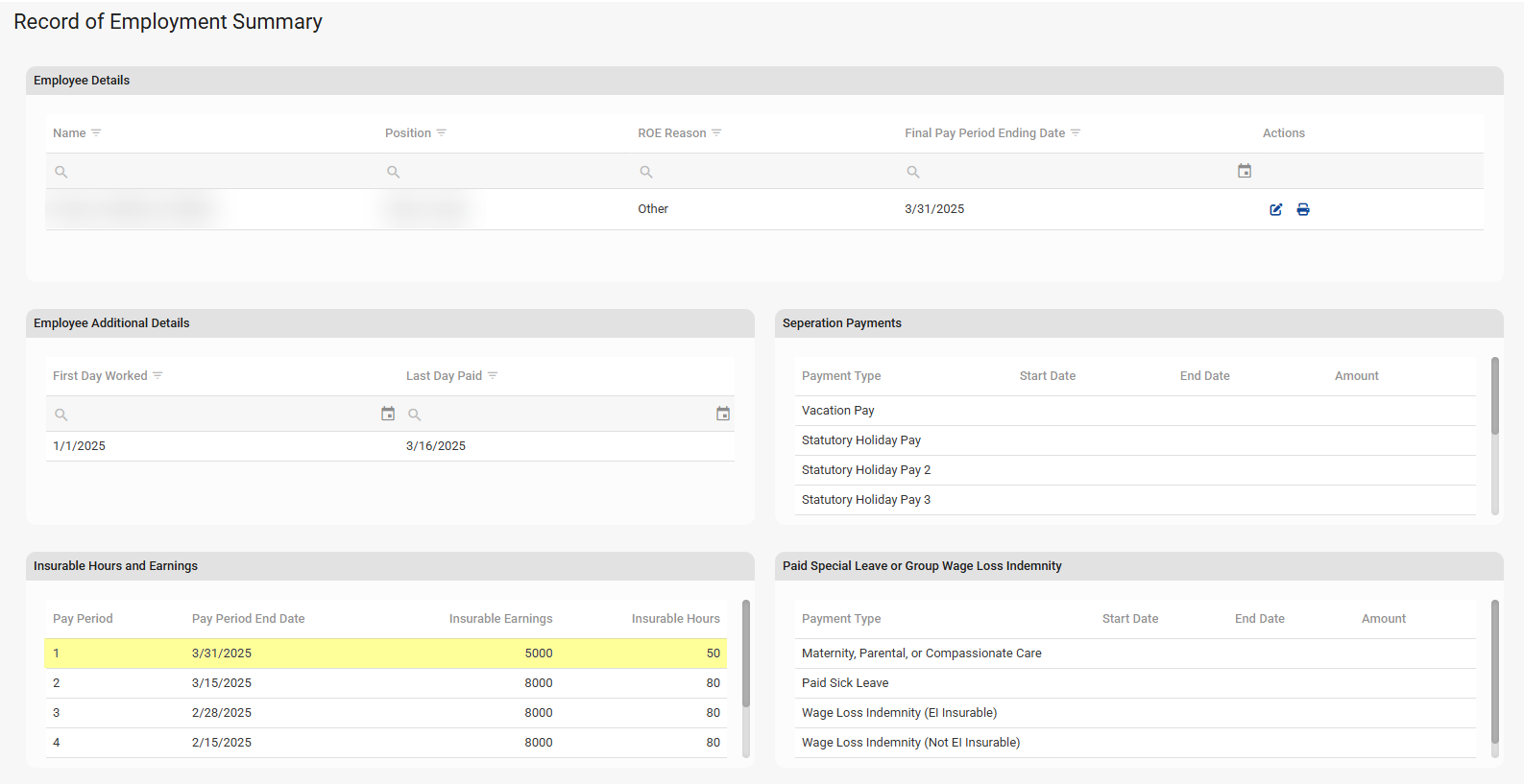 A Record of Employment (ROE) is required by Service Canada when an employee is placed on leave, resigns, or is terminated for any reason. Before creating an ROE, ensure the correct employee record is selected. Navigate > Employee Record > Payroll ...