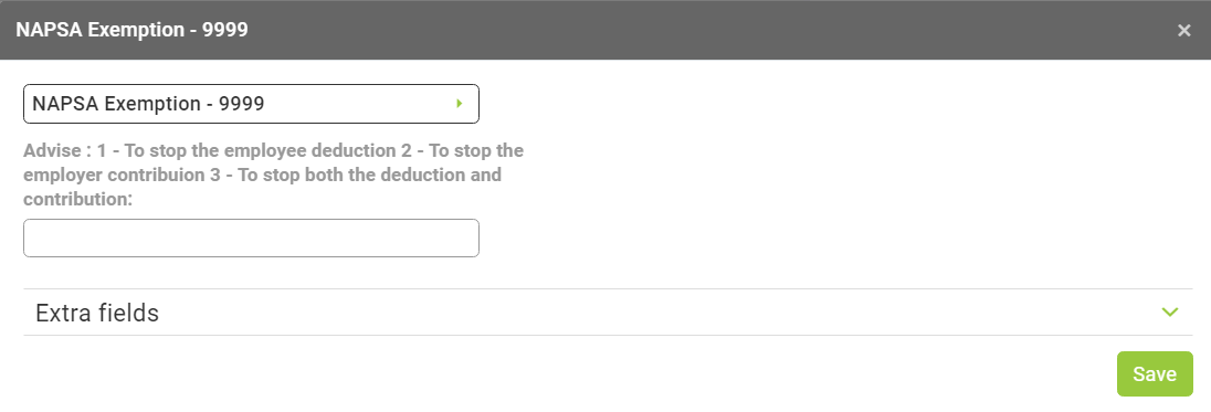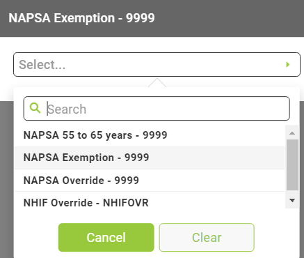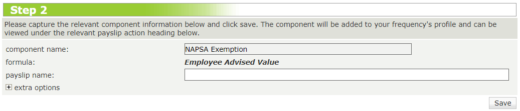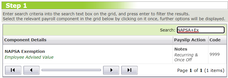 The NAPSA Exemption component has to be created on company level before it can be added either on an employee's Edit Payslip or Recurring Payroll Components screens.