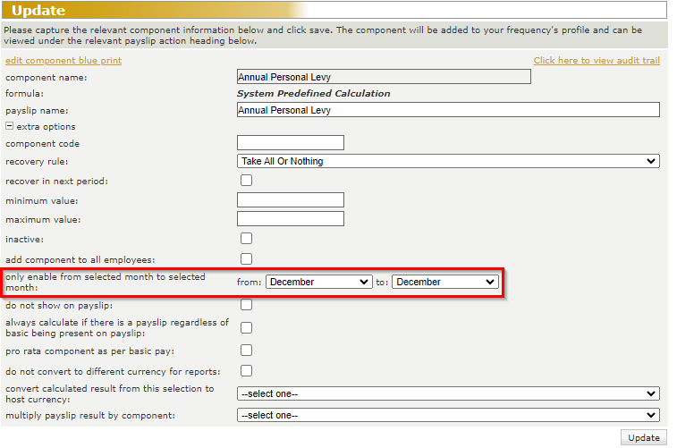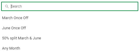 Note! if the dropdown option "Any Month" is selected, specify on the Payroll Components screen in which month the deduction should calculate. Example: