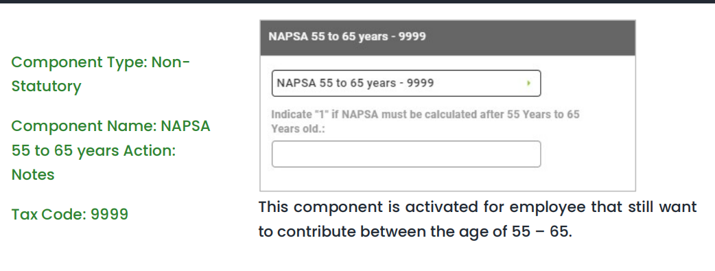 Example, if a employee is 59 and will be 60 in April, the NAPSA contributions will continue to calculate until April of the same year. In April the NAPSA contributions will no longer trigger automatically as the employee has reached the legal retirement age.