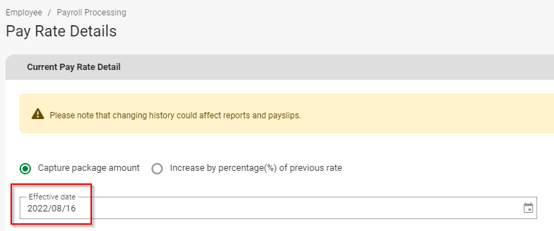 Payspace selects the maximum effective date from payrates where the effective date is less or equal to the period end date/s.