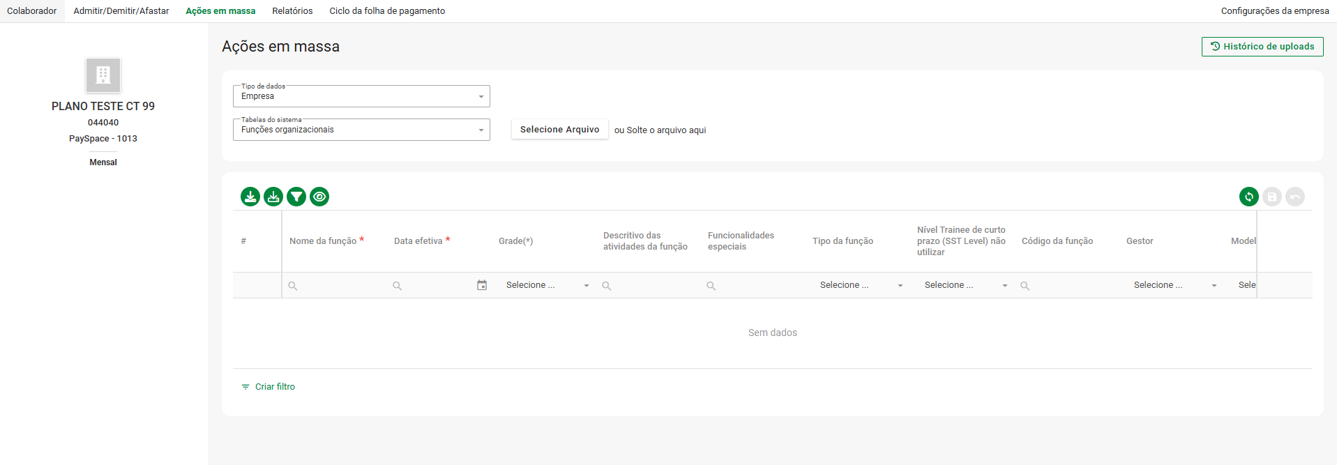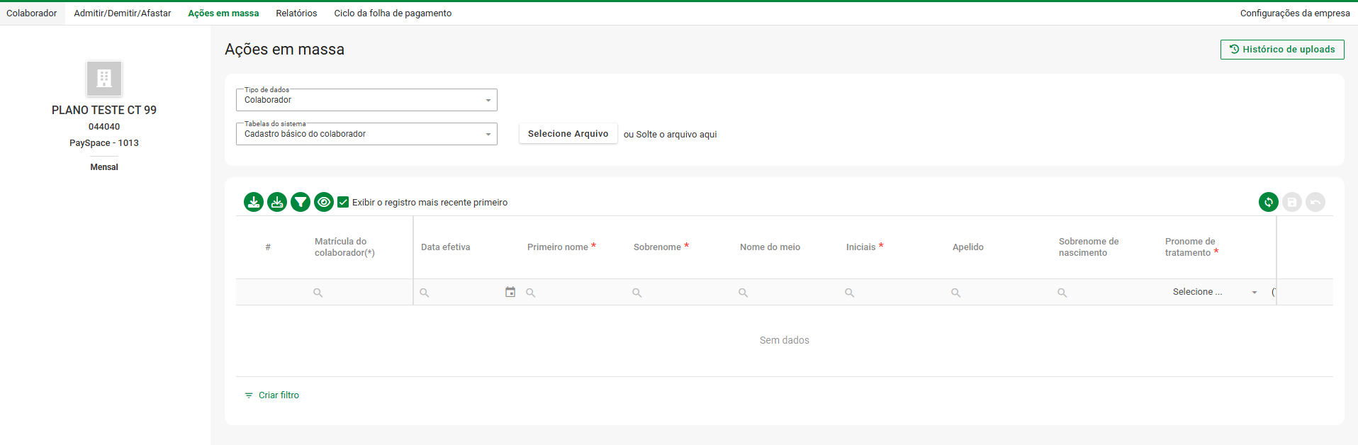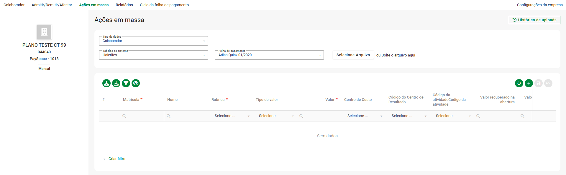 | Ação do holerite | Este campo indica se a empresa está na edição Lite, Premier ou Master. |