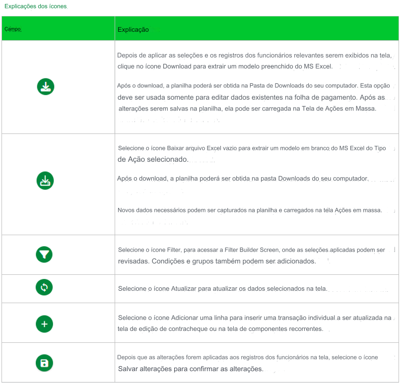 | Execução do holerite | Esta opção estará disponível se você selecionar o Tipo de Ação Holerite e Recorrente. Selecione a Execução Aberta para qual as inclusões em massa devem ser comprometidas. |