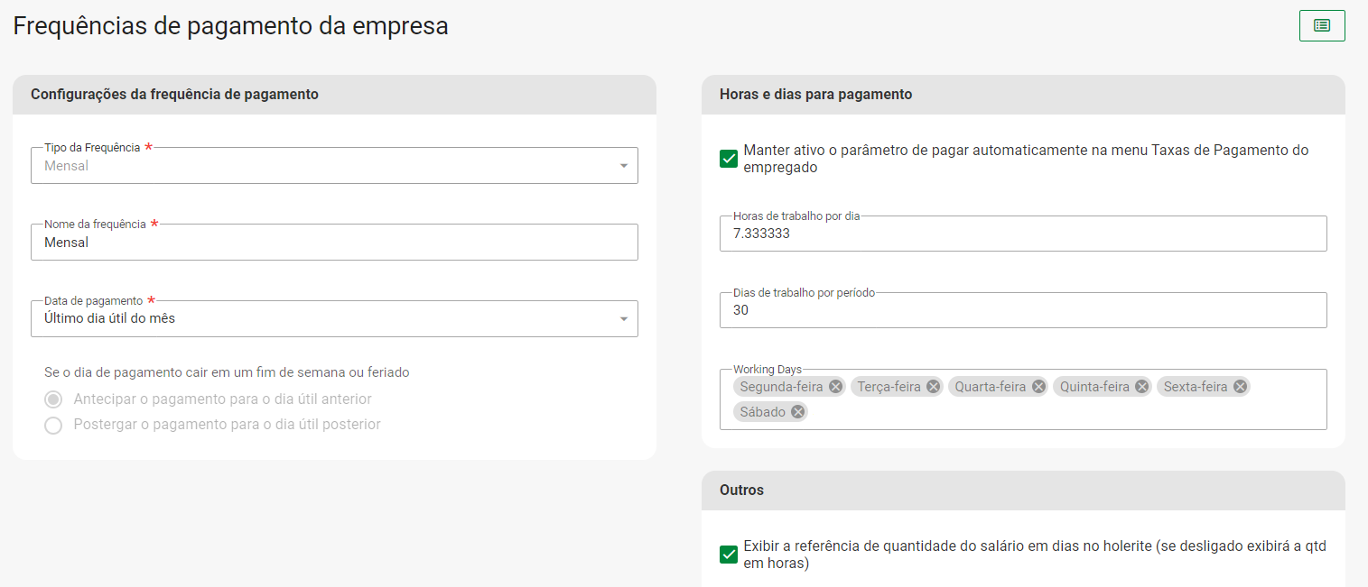 Navegue > Configuração > Folha de Pagamento > Configuração da Folha de Pagamento > Frequências de Pagamento