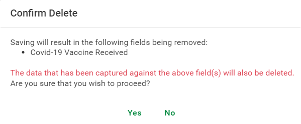 Caso tenha havido processamento de informações no campo que está sendo excluído, uma mensagem pop-up aparecerá para confirmar a exclusão (após a exclusão do elemento, antes da atualização da tela).