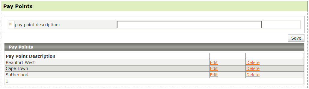 Os Pay Points podem ser criados como parte da estrutura Advanced Organization. Para atribuir um funcionário a um Pay Point, eles primeiro precisam ser criados no nível da empresa na seção Pay Points na tela Other Drop Downs .